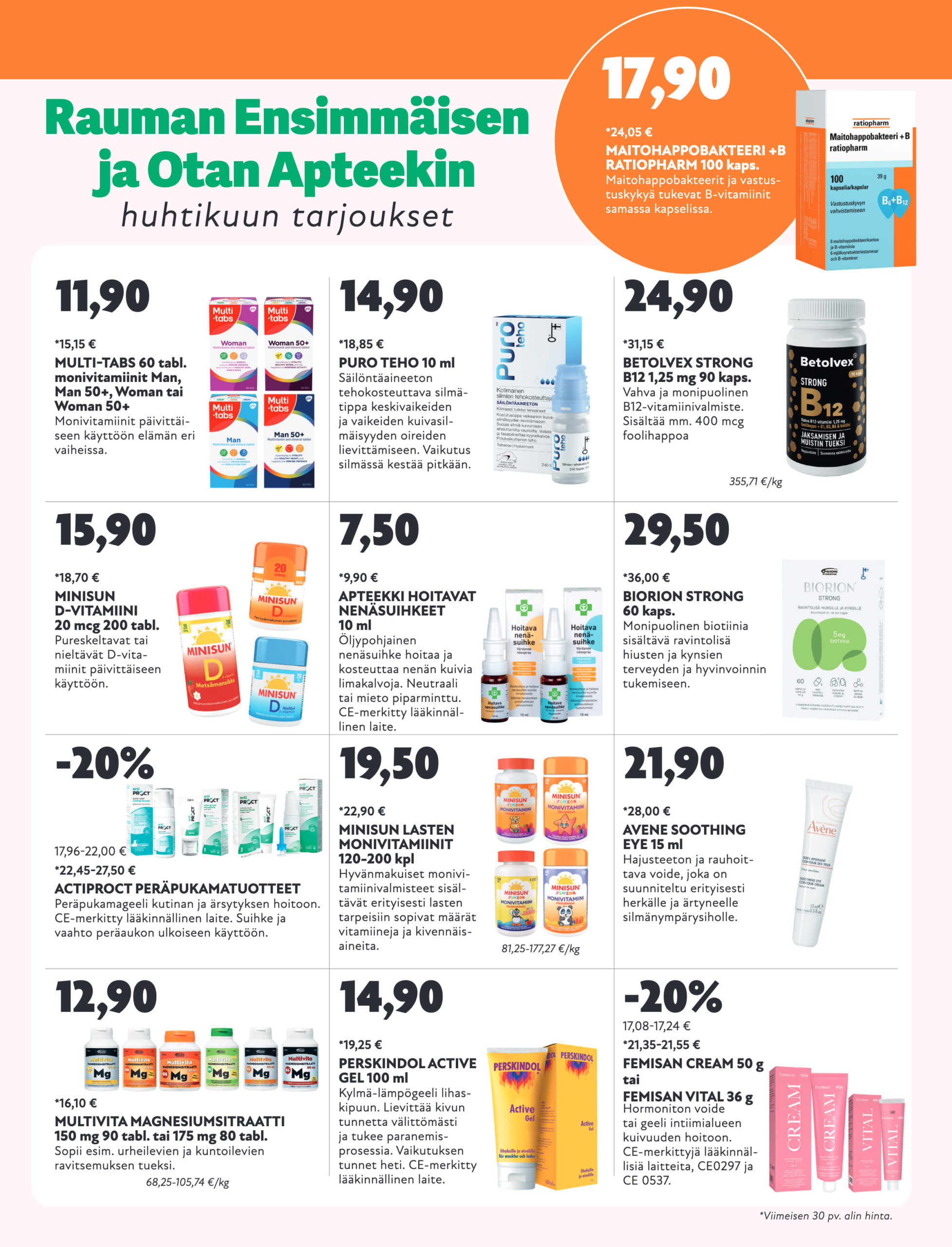 Jo monia maailmanvaiheita nähnyt Rauman Ensimmäinen Apteekki palvelee nykyaikaisissa ja valoisissa tiloissa Citymarketissa. Vaikka olemme Suomen vanhimpia apteekkeja, on filosofiamme varsin ajaton: kaiken toimintamme ytimessä on ystävällinen ja ammattitaitoinen asiakaspalvelu terveytesi hyväksi. Olemme avoinna joka päivä!